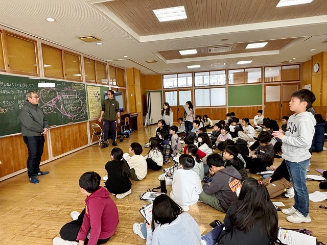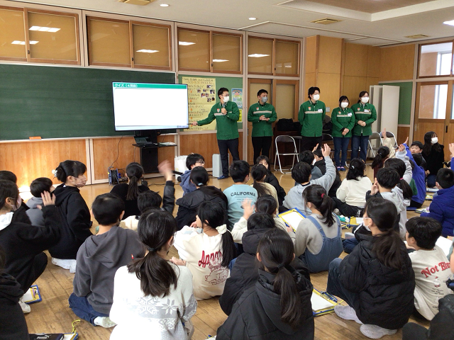 寒さに負けず 3学期がスタートして、早一カ月が過ぎようとしています。寒い日が続いていますが、どの学年も熱心に学び続けています。 <1年生:雪遊び> <4年生:ゲストティチャーを招いての総合的な学習の時間> <5年生:社会科での出前授業>